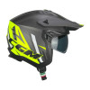 Prodotto con calotta in HPT (High Performance Terpolymer) dotata di frontino parasole facilmente removibile grazie al kit trasformazione jet incluso nella confezione. Questo modello è realizzato con visiera interna parasole multiscatto e Air Stream System a quattro zone di canalizzazione d'aria. Dispone di interni temoformati esagonali con tessuto ExtraCool con bande alta visibilità, è predisposto per l'uso di occhiali e per alloggiare l'interfono aftermarket. Completano il casco l'anello antifurto, la fibbia micrometrica e l'elastico fermacinturino.