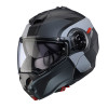 Casco modulare in termoplastica, chiusura micrometrica, doppie prese d’aria anteriori, visiera parasole a scomparsa, visiera trasparente. Fodera estraibile e lavabile, predisposto per qualsiasi tipo di interfono.
